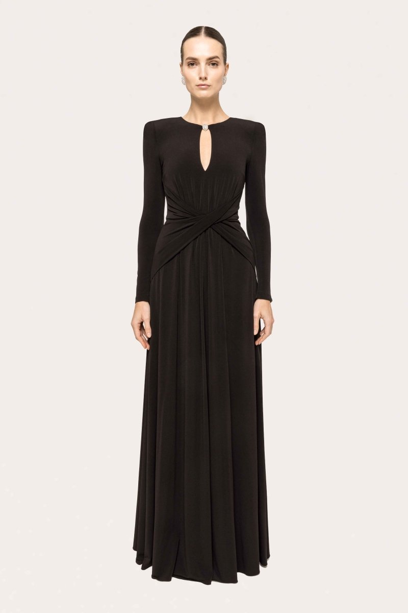 An elegant draped keyhole long gown defined by a sculpted keyhole neckline and refined draped detailing that enhances the waist.