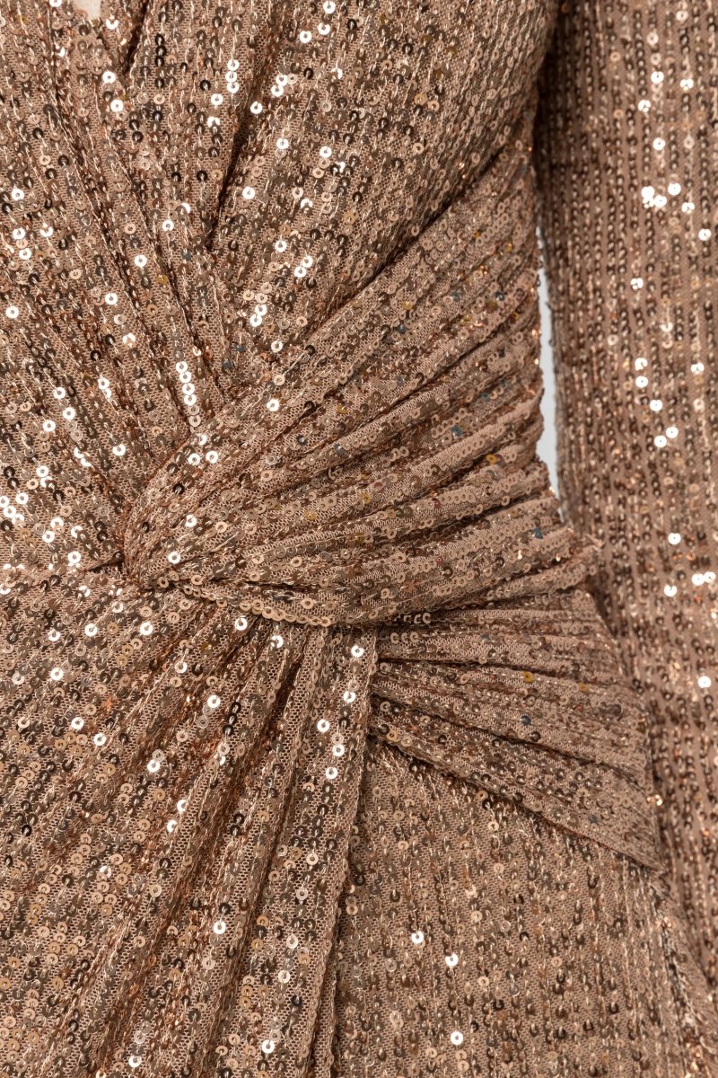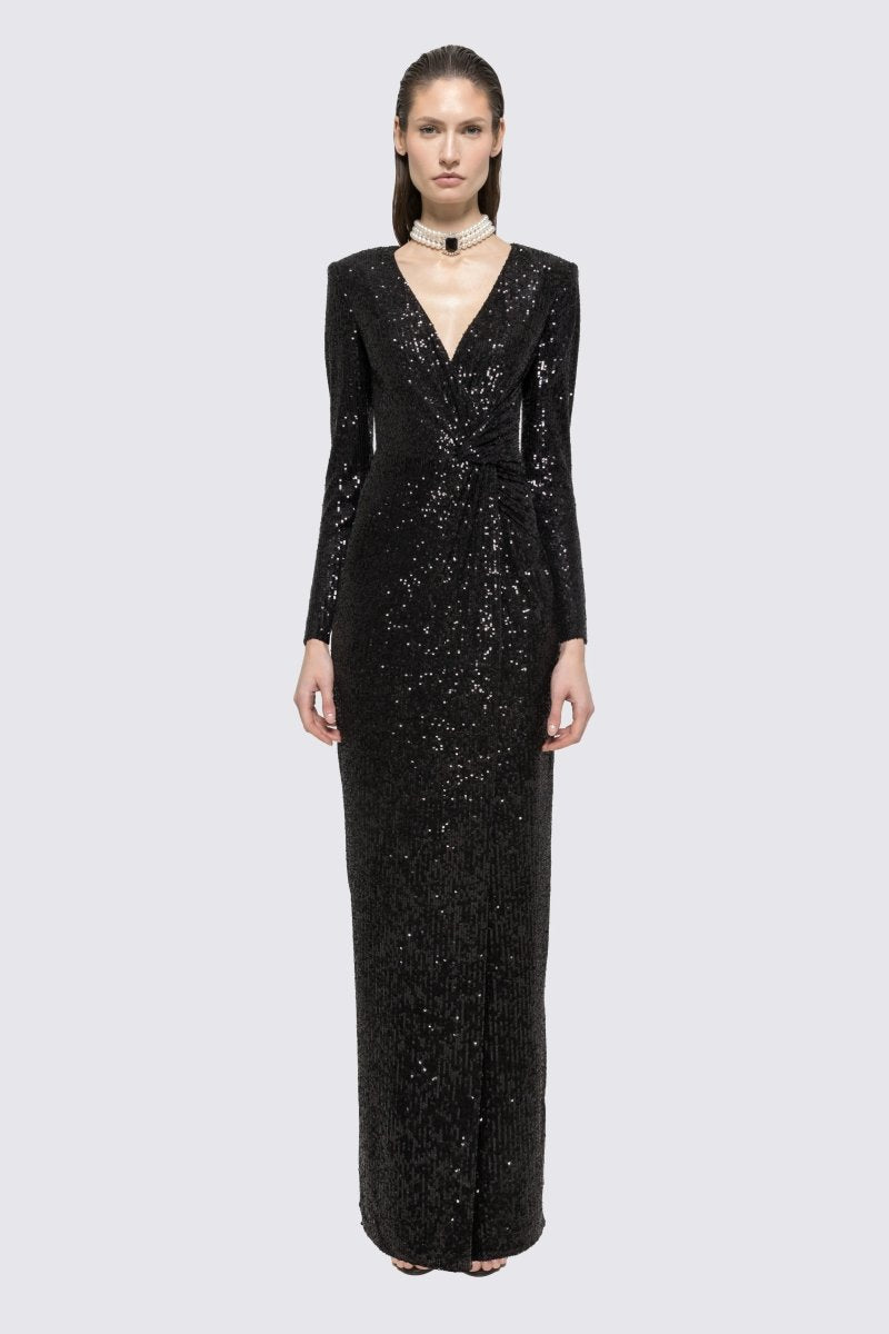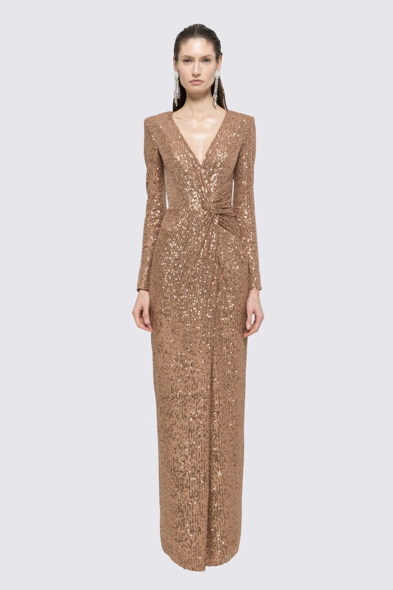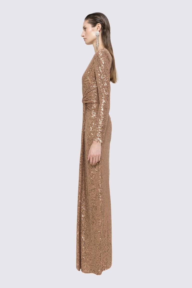 This elegant sequin gown brings structure and sparkle together, with a gathered waist and long sleeves for timeless sophistication.