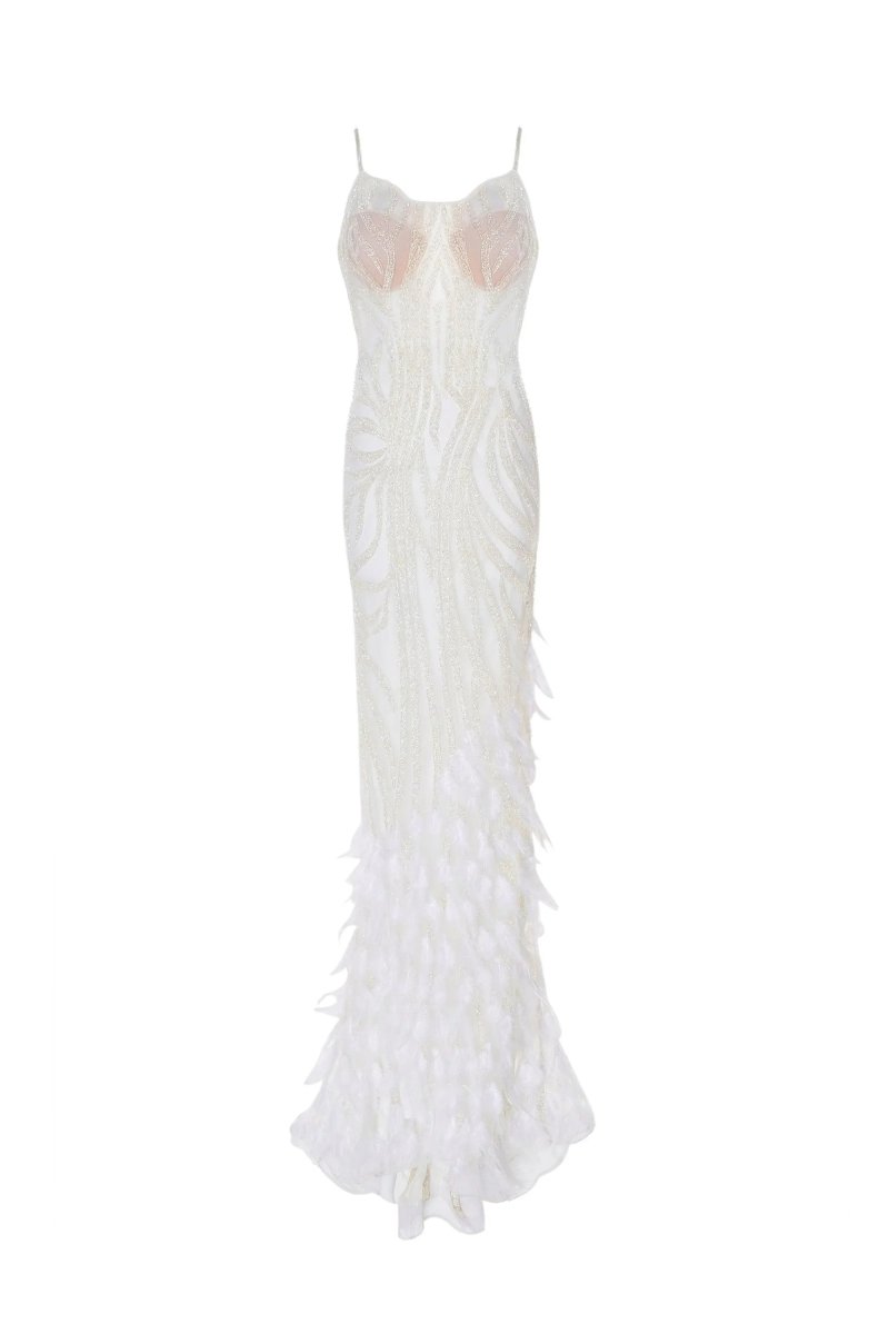 This captivating mermaid gown blends intricate sequin embroidery with delicate feather accents along the hemline. Designed with thin straps and a fitted silhouette, it highlights graceful femininity while exuding modern glamour. Perfect for gala nights, weddings, and unforgettable red-carpet moments.