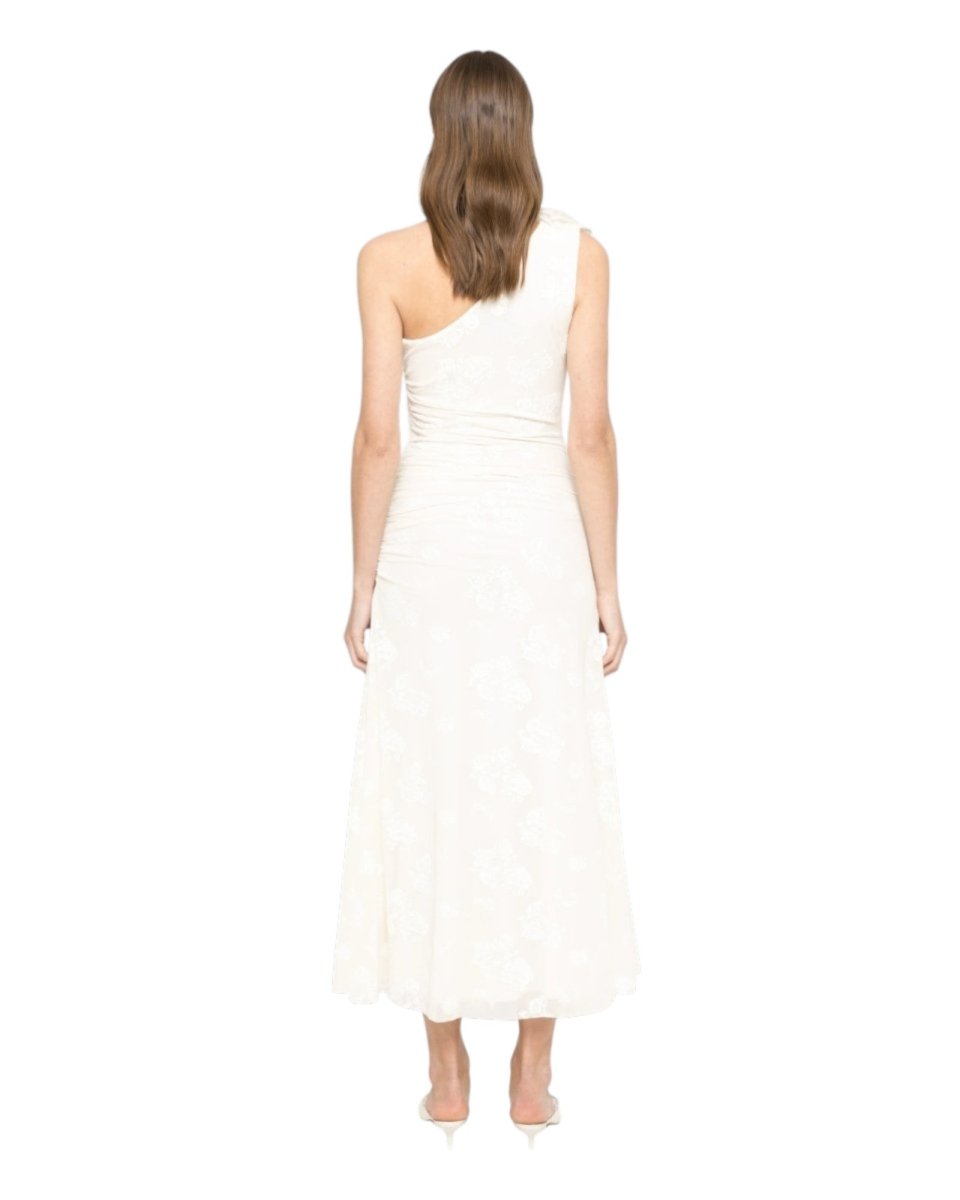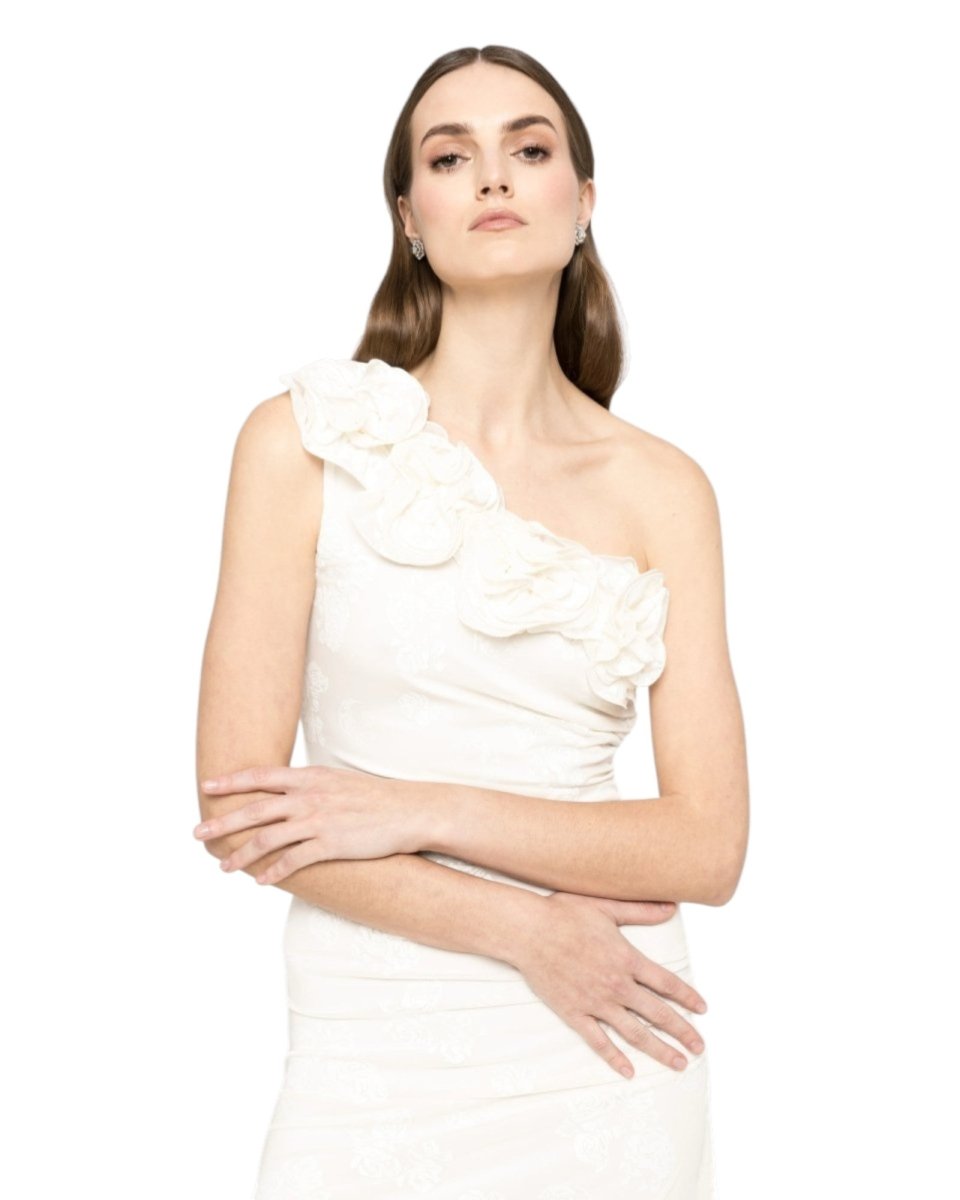 This romantic one-shoulder silhouette exudes softness and charm with blooming detail and subtle texture.