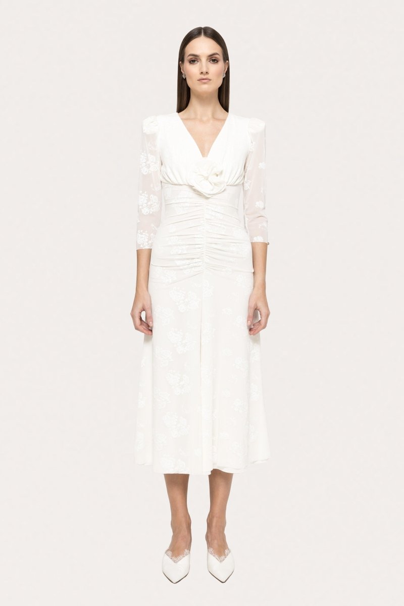 A graceful long-sleeve dress featuring intricate floral embroidery and delicate ruching along the bodice. Designed for an effortlessly romantic and refined silhouette.