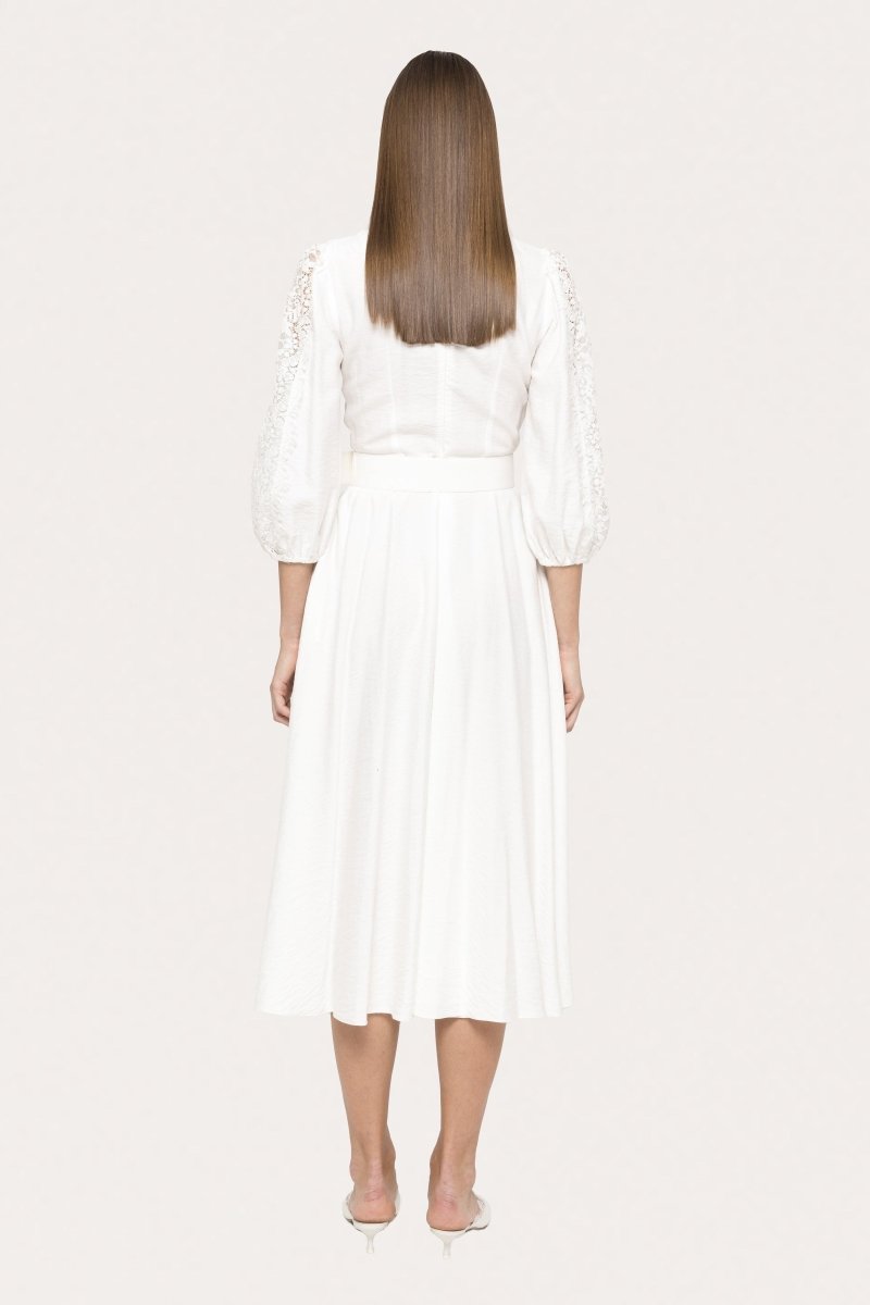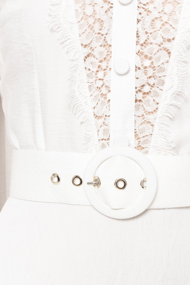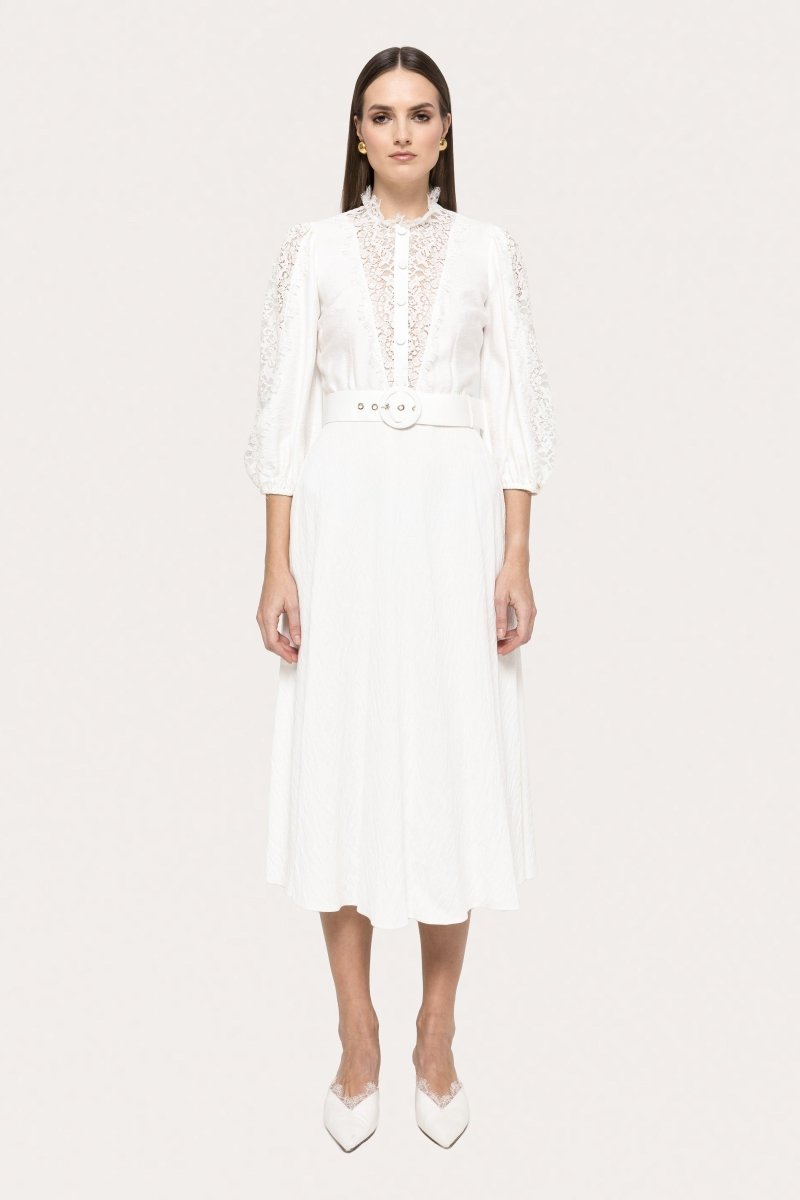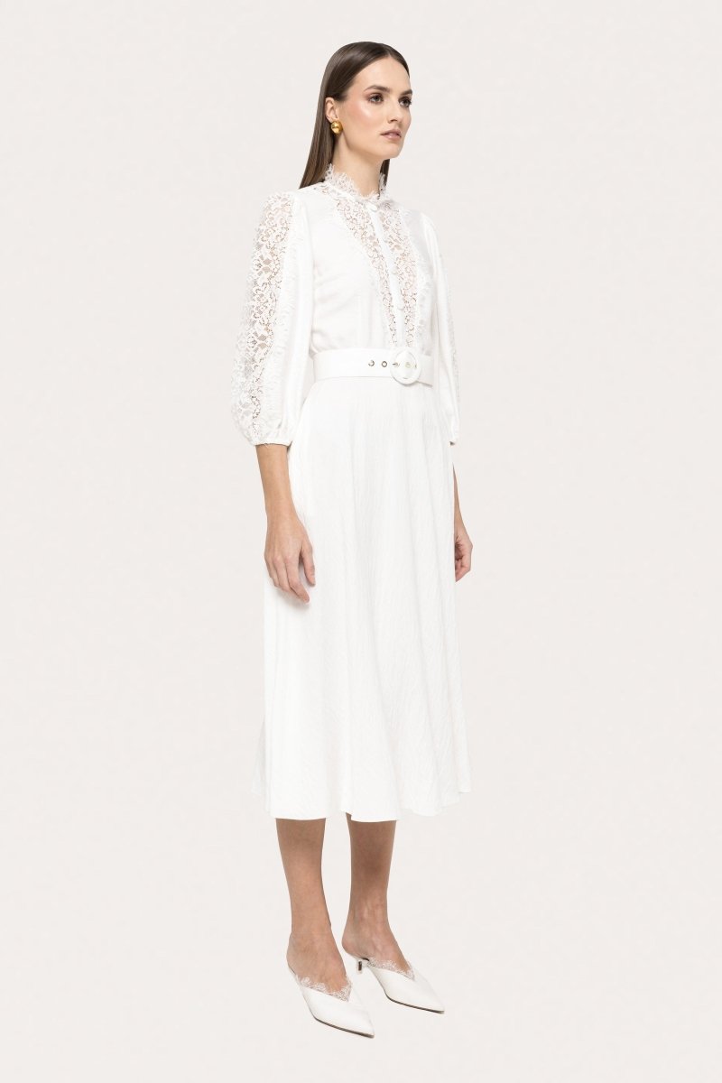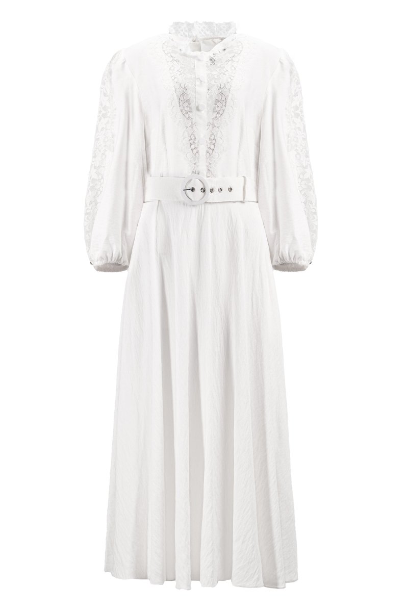 A timeless midi dress with intricate lace paneling, puff sleeves, and a statement belt. The high neckline and delicate buttons enhance its vintage-inspired elegance.