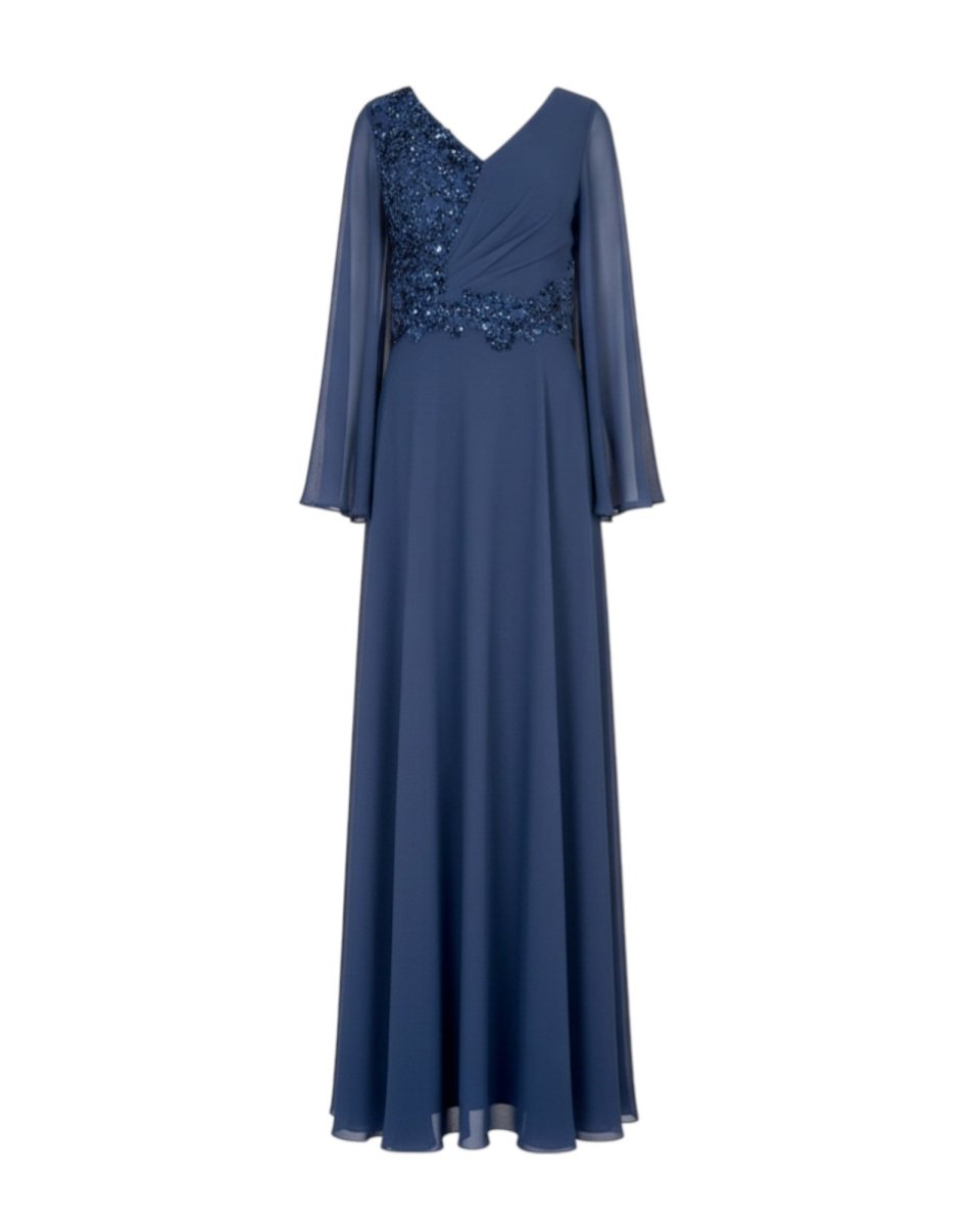 A refined evening gown featuring a softly draped bodice with delicate embellishment detailing, balanced by sheer long sleeves and a fluid skirt that moves with effortless grace. Designed for understated glamour and timeless sophistication.