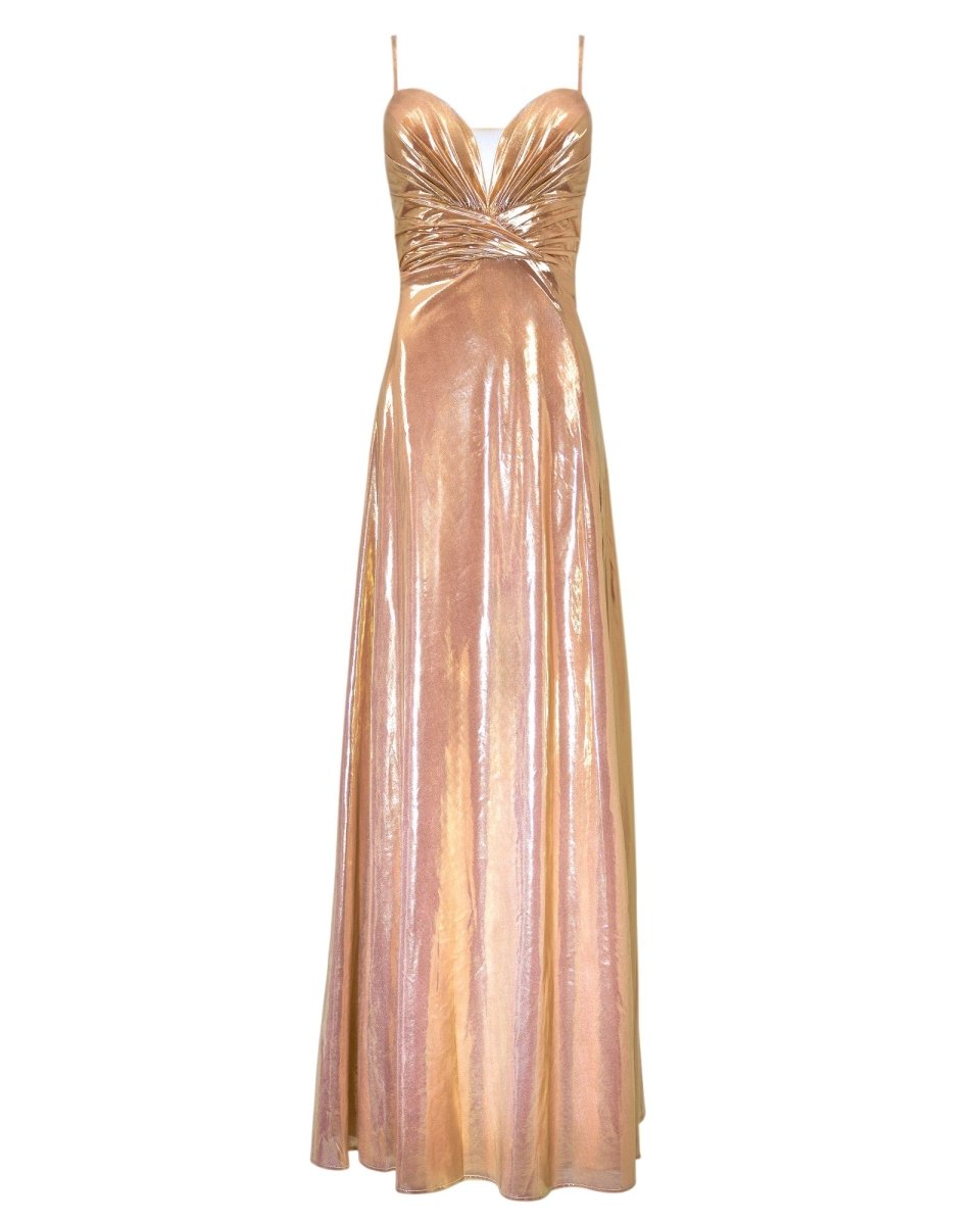 This eye-catching gown features a pleated bodice with delicate ruching, exuding sophistication and charm. Its flowing silhouette enhances the movement for a striking effect.