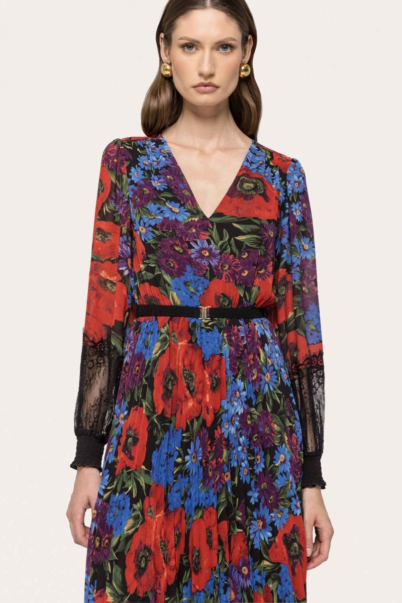 A vibrant floral lace midi dress crafted with a wrap-inspired bodice, flowing asymmetric hem, and delicate lace detailing.