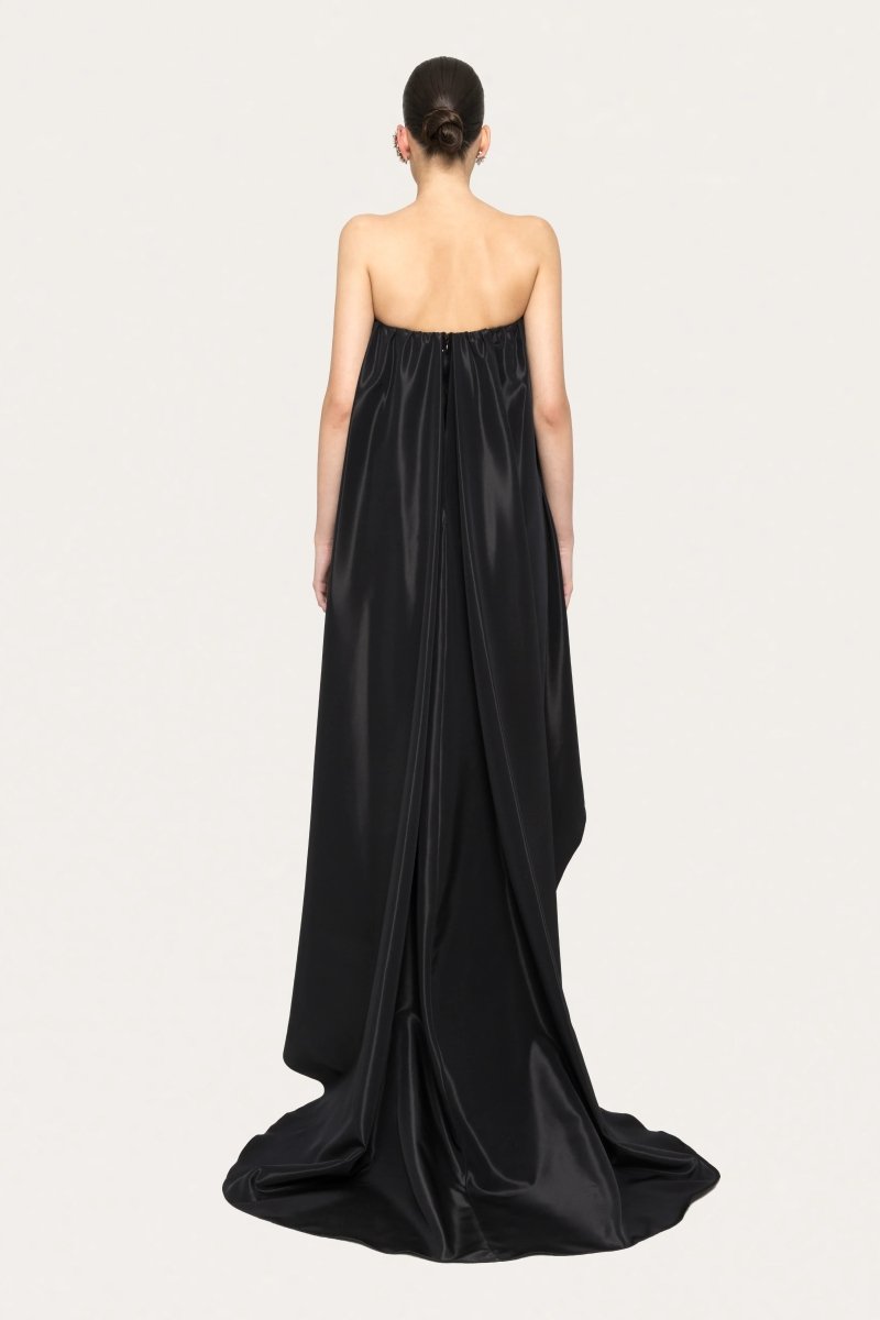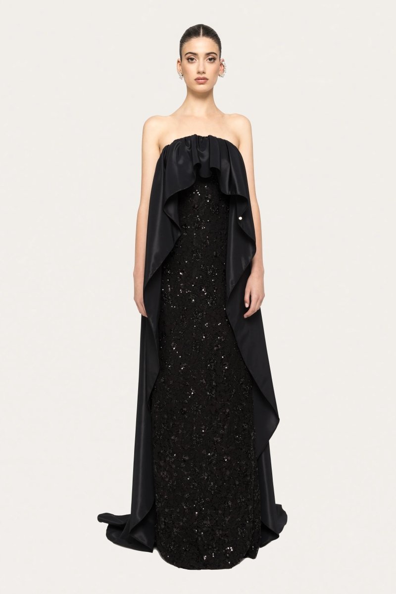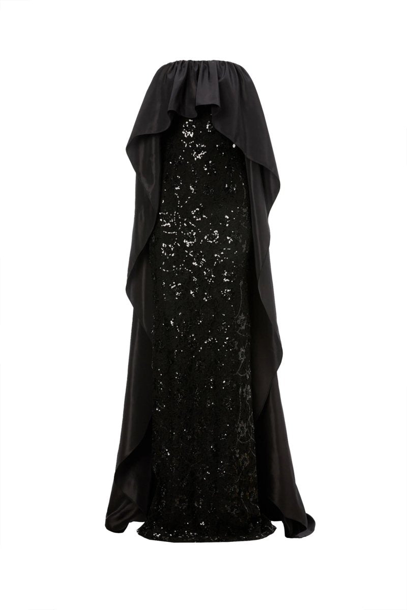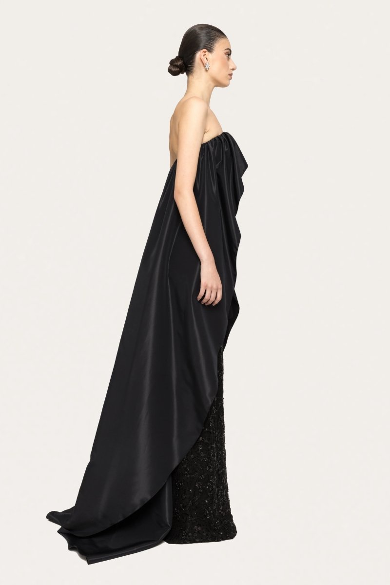 An alluring balance of texture and structure, this gown captivates with fluid draping and luminous detail.