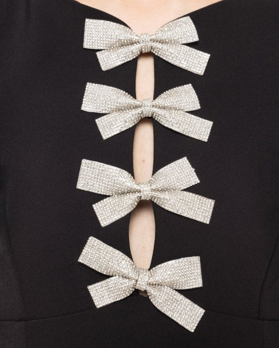 A refined midi dress with a playful twist, featuring cascading crystal bows that add charm and sparkle to a clean silhouette.