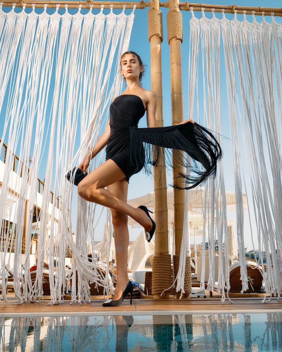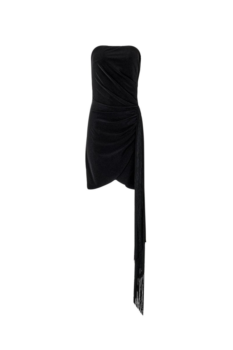 A sleek and striking mini dress with asymmetrical draping and an extended fringe detail, crafted for after-dark elegance and confident flair.