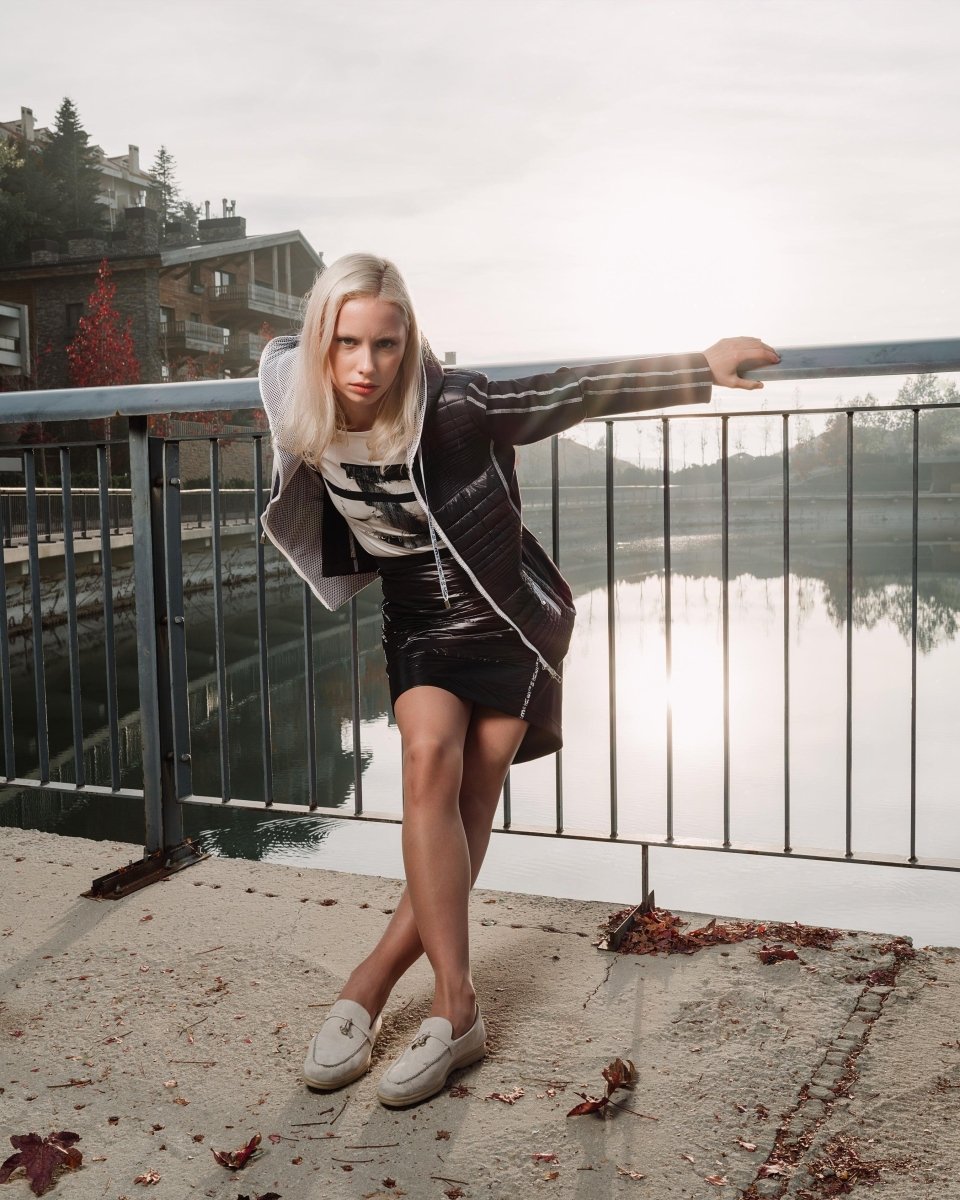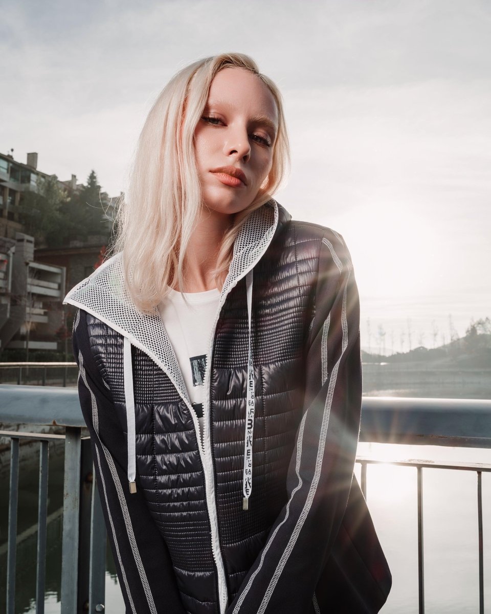 This structured cotton top features a striking artistic face print with bold brushstrokes, combining clean lines with expressive detail.