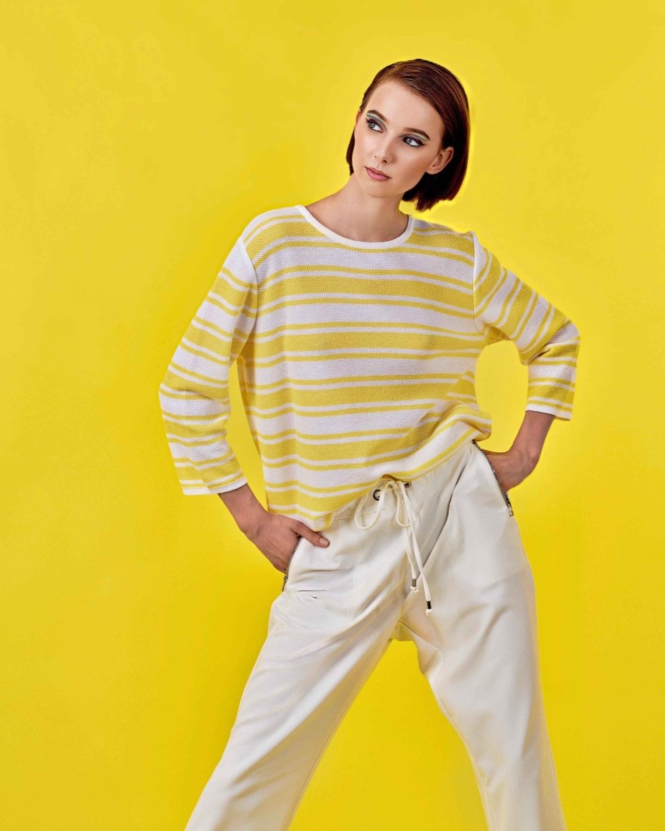 This relaxed knit blouse brings a cheerful edge to casual wear, with its refreshing striped design and easy silhouette.