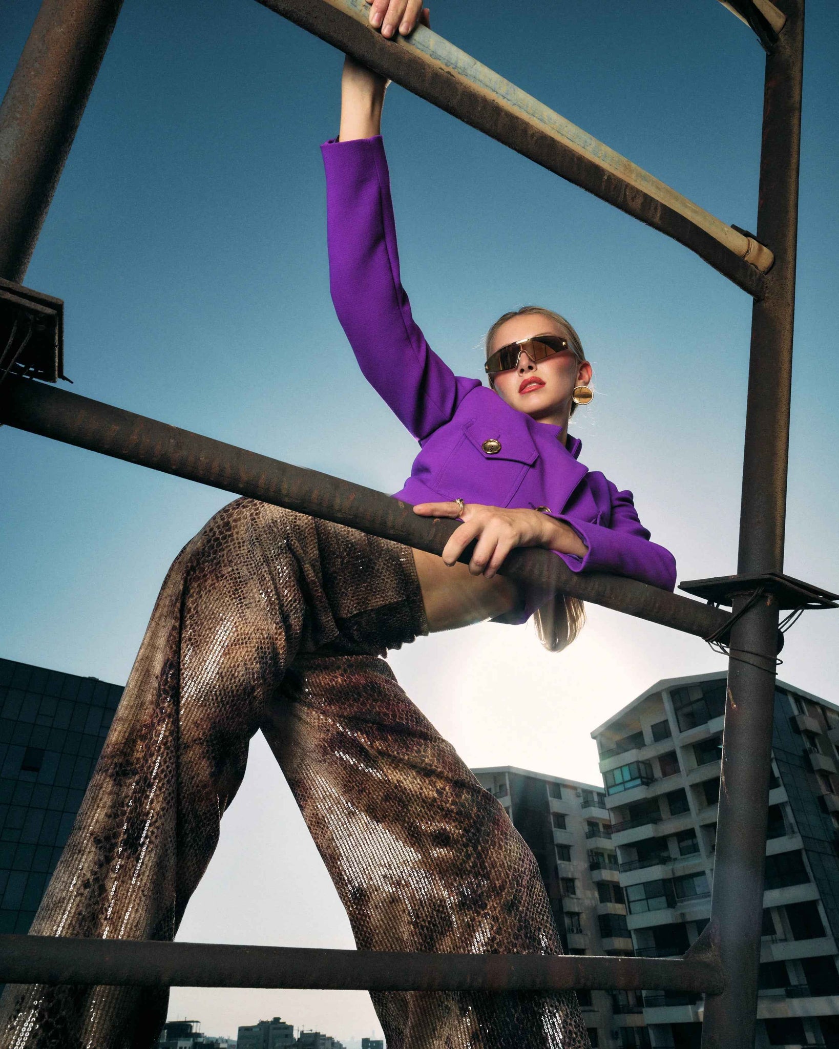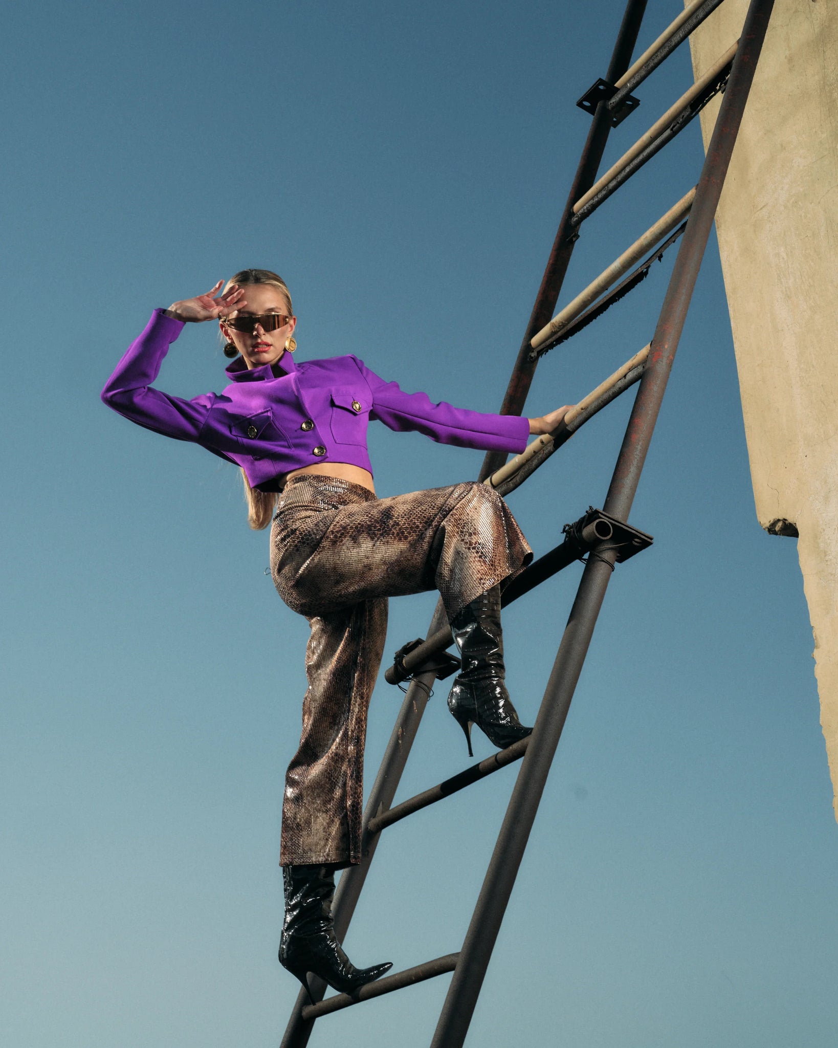 A bold two-piece ensemble in metallic python-textured fabric, exuding modern sophistication and strength. The sleek cut and reflective finish create a commanding, high-fashion statement.