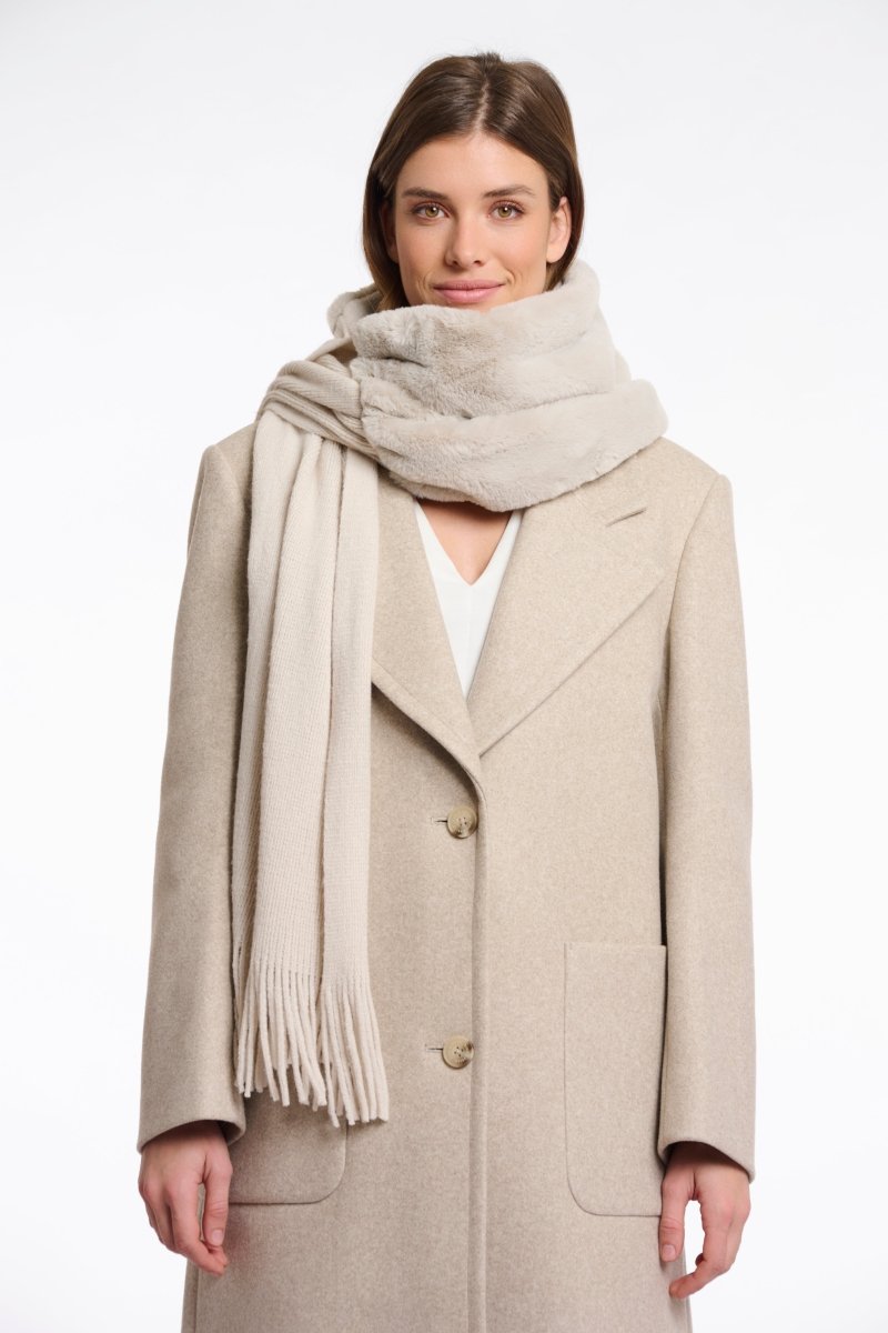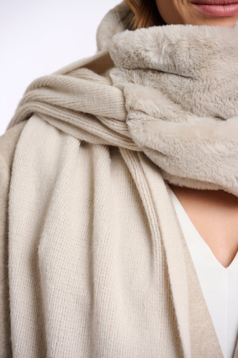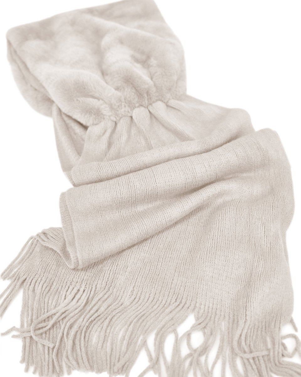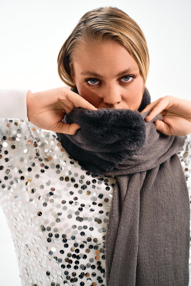 A cozy and stylish scarf featuring a soft knit body with luxurious faux fur trim.