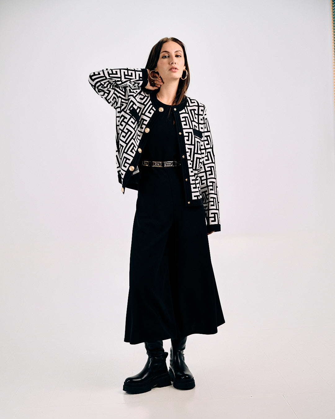 Bold jacket featuring an all-over geometric pattern, framed with contrast trim and adorned with gold-tone statement buttons. A striking mix of structure and modern flair.