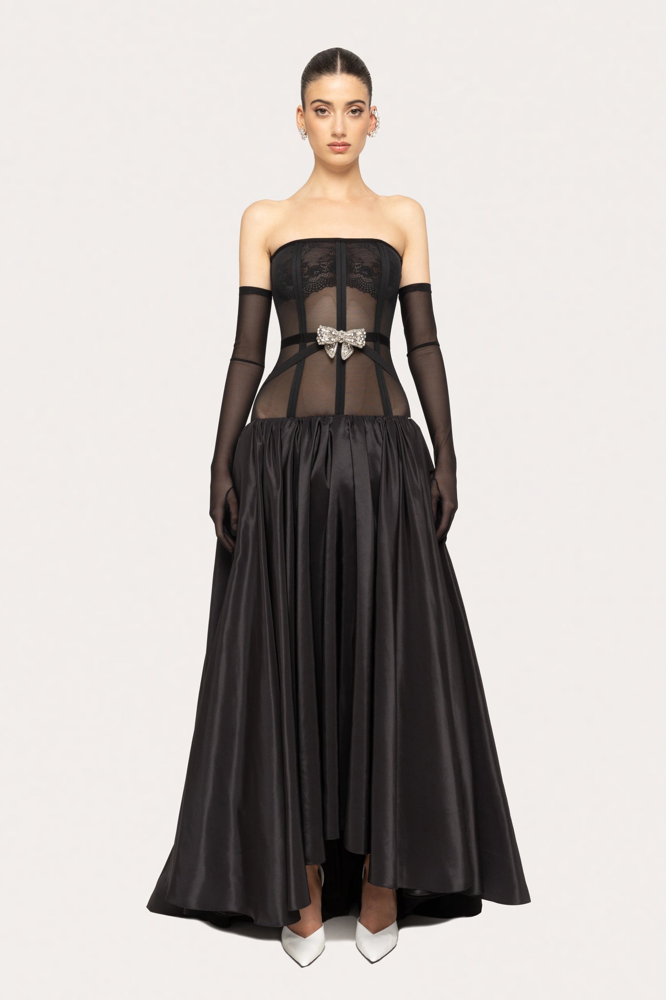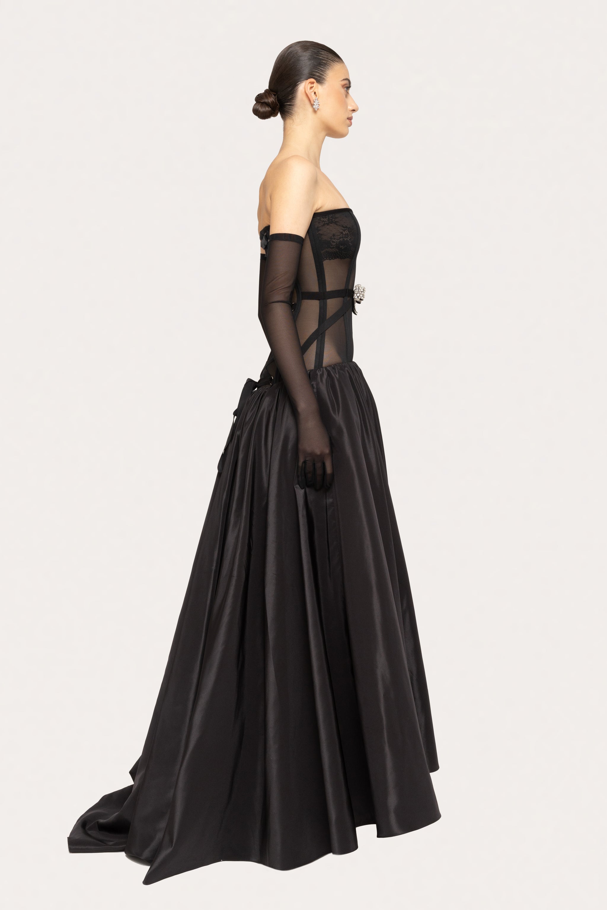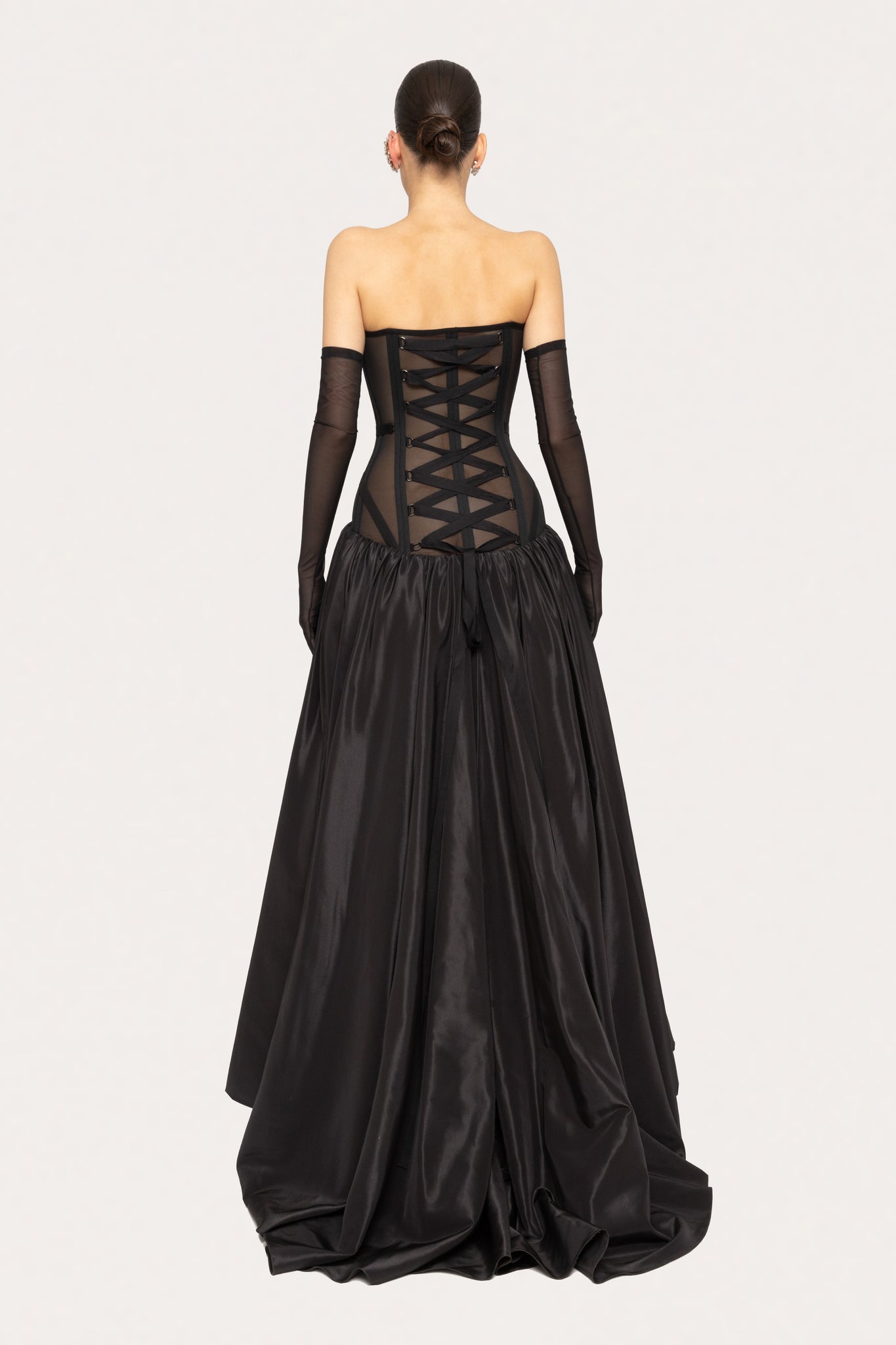 A bold couture silhouette featuring a sheer corset bodice, structured boning lines, and a voluminous satin skirt for striking evening presence.