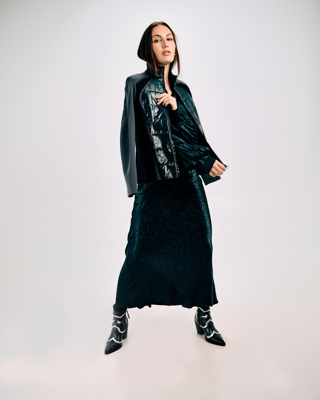 Dynamic zip-up jacket combining sleek fabric panels with a glossy quilted front. Designed for modern versatility with a sporty yet refined edge.